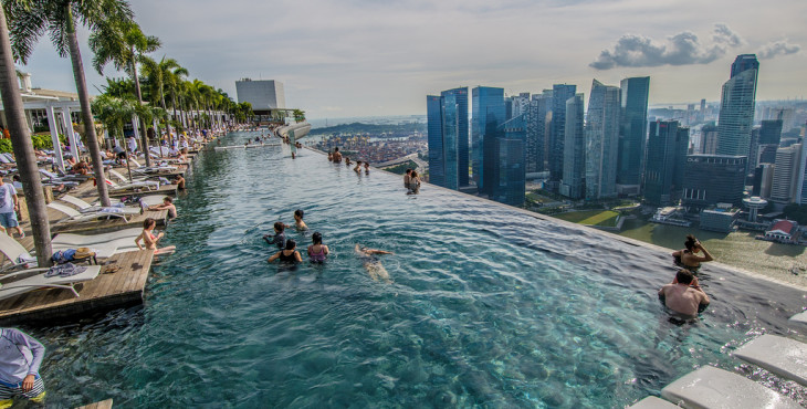 Construída no 57º andar e com uma vista de tirar o fôlego da cidade de Singapura, na Ásia, a piscina do hotel Marina Bay Sands é uma das maiores piscinas do mundo. Nela, os hóspedes podem aproveitar um belo dia de sol para se refrescar ou apenas para apreciar a belíssima paisagem composta pelos gigantes arranha-céus da cidade. Uma experiência única!